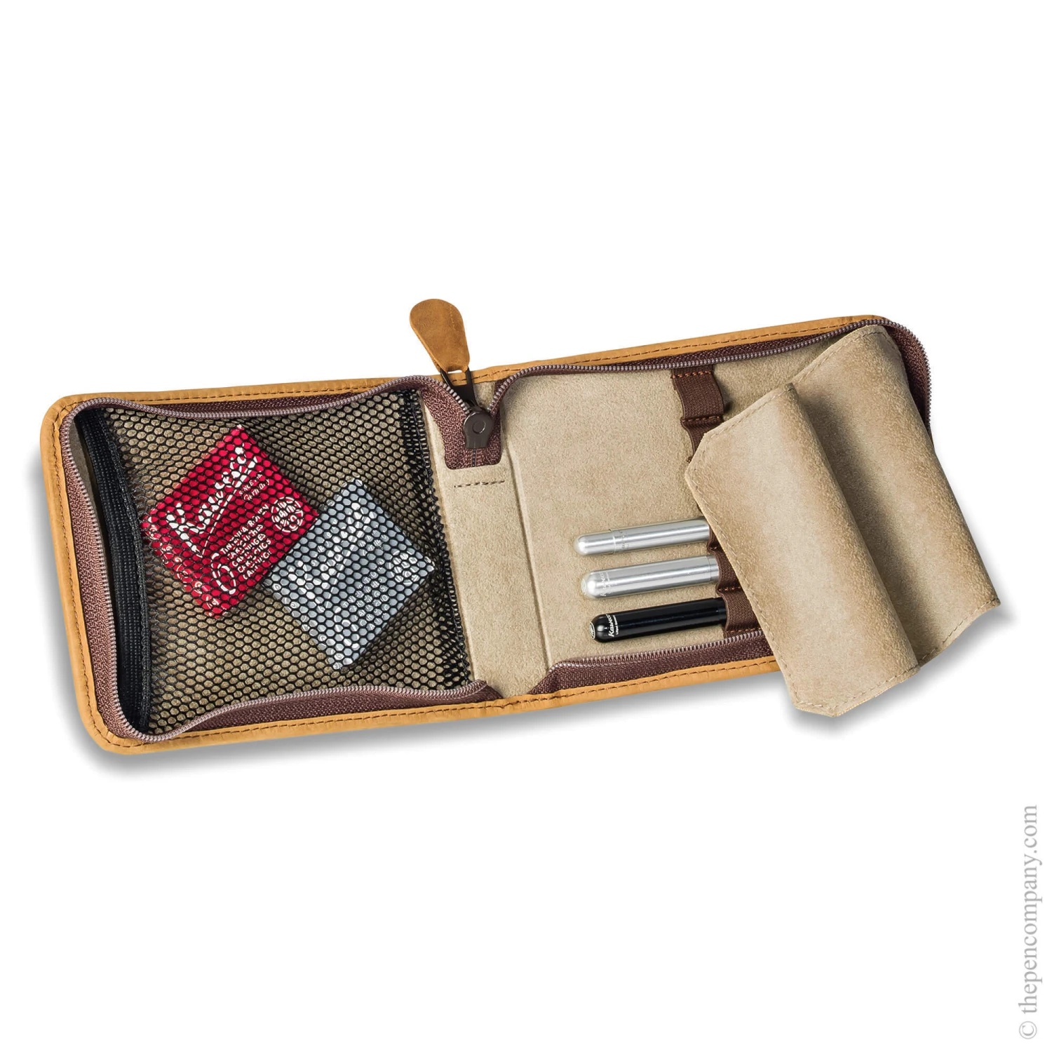 - The ‘Traveller Case’ is made from hand-stitched soft nubuck leather and has elasticated slots to hold up to 6 pens. A fabric flap separates the pens from items stored in the zip closure mesh compartment.