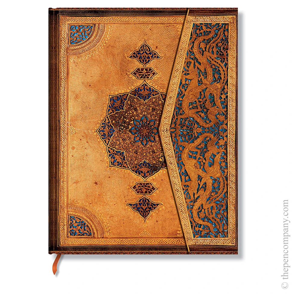 The Safavid dynasty were one of the most significant ruling dynasties of Iran and the Persian Safavid-style designs associated with the Islamic Golden Age represented a peak in the art of binding. This journal portrays a leather filigree pattern featuring handtooled surfaces and motifs that retain an elegance and style even in our modern context.
